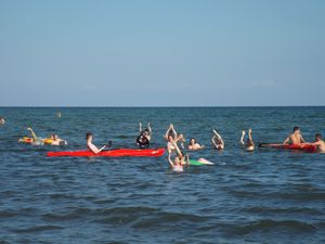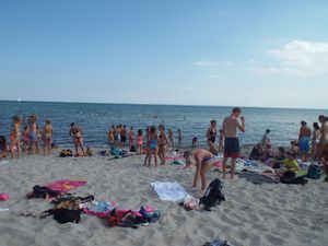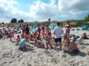 Heute am Nachmittag war Party am Stand angesagt. Alle Teilnehmer machten sich nach der Mittagspause auf den Weg zum Strand. Und wenn ca. 300 Kinder und Jugendliche mit ihren Betreuern am Stand einfallen, dann rückt so manch ein Ruhesuchender eher ein Stück weiter. Wir sind an den Strandabschnitt gegangen, der einmal zum Zeltplatz der Stadt Braunschweig gehörte. Dort hatte die Animation bereits die Disko aufgebaut. Das größte Spielangebot war das Meer, das, auch wie überraschend ;-) direkt an den Stand mündete. Ok, dass ist nichts besonderes und doch, bei dem für uns extra gebuchten Superwetter mit Sonne, Sonne, und wieder Sonne, einfach der beste Spielplatz ist, den es gibt. Dazu hatte die Ani die Kanus vom Zeltplatz mitgebracht. So konnten unsere Teilnehmer mit den Kanus rausfahren. Manche waren dann aber dennoch mehr neben dem Boot als im Boot. Es ist einfach zu reizvoll die anderen mit dem Boot zum kentern zu bringen.