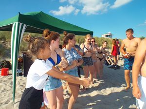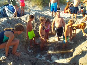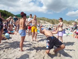 Im Sand gab es aber noch so manche andere Aktion. Da war eine Schatzsuche. Ok, zugegeben, es gab keinen Piratenschatz. Aber die Teilnehmer fanden so manches Gummibärchentütchen. Direkt daneben fand der Sandburgenwettbewerb statt. Vor der Disco lief Limbodance. Es sollte auch eine Strandlounge geben. Leider scheiterte der Versuch. So buddelten einige Teilnehmer ein tiefes Loch. Als sie das Wasser im Erdreich erreichten, motivierte Lennard die Teilnehmer mit Wassereimern Wasser aus dem Meer zu schöpfen, um ein See zum Baden zu machen. Er erzählte ihnen aber wohl nicht, dass der Sand das Wasser fast gar nicht hält. so gab es zwar einen kleinen Tümpel, im dem manche auch hineinsprangen. Aber mehr war da nicht zu holen.