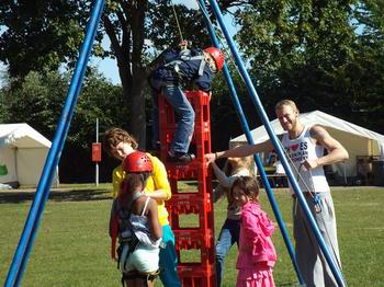 Großspielgeräte Den ganzen Tag waren heute die Großspielgeräte auf dem Platz aufgebaut. Gestern waren sie schon angekommen und sie wurden auch gleich aufgebaut. Aber leider hatten es die Geräte nur eine halbe Stunde vor dem Regen geschafft, dann musste alles wieder abgebaut werden, da das Wetter nicht wollte, dass die Hüpfburg genutzt werden kann. Heute beschenkte uns das Wetter! Wir hatten einen blauen Himmel, fast den ganzen Tag. So wurde heute gehüpft wie wild oder um die Wette. Es gab auch die Möglichkeit auf Colakisten zu klettern. |