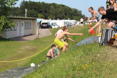 Dorf 5 hatte sich für die Deichrutsche angemeldet. Das Ziel war einfach: den Deich hochkommen! Aber der Weg ging über eine Plane, die am Deich mit Zeltheringen befestigt war. Auch dass würde ja noch gehen, wenn da nicht auch noch Schmierseife und Wasser mit im Spiel gewesen wäre. einige schafften den Weg nach oben. Aber das wichtige war ja auch der Spaß dabei nicht das Ergebnis. Der Weg ist halt das Ziel. (mehr Bilder) |