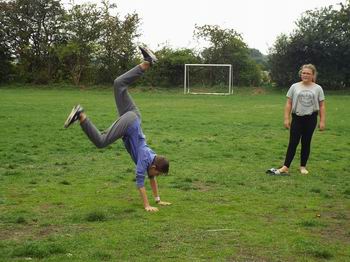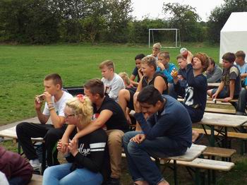 Auch die Dörfer waren wieder in Aktion. Das Dorf 5 z.B. wollte ursprünglich heute zur Steilküste fahren. Doch war das Wetter heute morgen so wenig einladend, dass die Tour abgesagt wurde die Gruppe im und um das Sportzelt Aktionen durchgeführt haben. So wurde Playstation gespielt und auf dem Platz gegrillt. Später konnte jeder einzeln zeigen was er besonderes kann. Ich sah dabei 4 Räder oder einen Handstand und vieles mehr. |