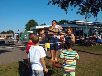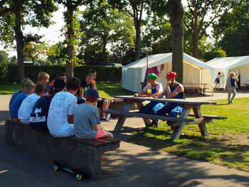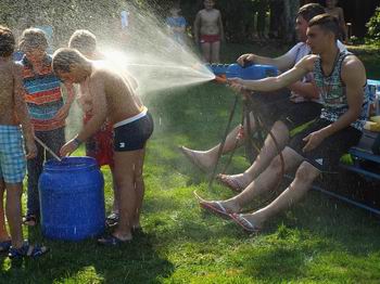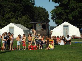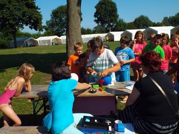 Auch heute ging es wieder mit einer Exklusivvorstellung für die Teilnehmer im Grömitzer Kino los. Diesmal stand ein anderer Film auf dem Programm. Am Nachmittag waren für den großen und kleinen Zeltplatz die Großaktionen dran. Für die Kinder vom kleinen Zeltplatz waren 6 Stände aufgebaut. Da mussten Apfelstücken aus dem Wasser geborgen werden oder Schätze in Tonnen geangelt werden. Da wurden vermeintliche Verletzte geborgen und mit Tragen durch den Parcours getragen. Es wurde mit Kisten über den wilden Fluss gestelzt und über ein Seil gehoben. Am Schluss gab es das Stehkaffee als Belohnung für den anstrengenden Weg. Für den großen Zeltplatz stand Geocaching auf den Programm. Der Abschluss war durch ein großes Hot-Dog-Essen auf dem Platz am Fahnenmast für alle ein schmackhafter Hit. |