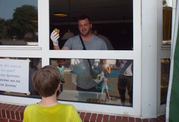 Heute war der Tag des Kuchens. Nach der Mittagspause stellten sich Maic und Patryk an die Fenster des Betreuerraumes. Von dort verteilten sie den Stehkaffee aus der Küche für die Teilnehmer und Betreuer. Denn am Tag des Kuchens wird Kuchen vom Blech verteilt. Alle waren begeistert. So einen leckeren Kuchen hat es auf dieser Freizeit noch gar nicht gegeben. Die Betreuer hatten dazu sogar Kaffee.