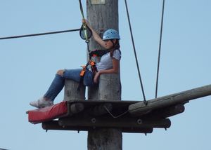 Der Tag heute fing wieder einmal sonnig an. Erst zum Mittag wurde es etwas schlechter. Angekündigt war ein Starkwind und Starke Regenschauer. Nun ja, es gab dann am Nachmittag auch wirklich Regen. Aber vorher schien mal wieder die Sonne. Einige waren am Strand, Dorf 5 hatte für den frühen Nachmittag einen Ausflug in den Hochseilgarten vom Lenster-Strand geplant. Sie hatten Glück. erst als sie fertig waren, verschlechterte sich das Wetter. Sie hatten also einen wunderschönen Nachmittag in schwindelnder Höhe. Die, die sich nicht so sehr in die Höhe trauten, haben auf dem selben Gelände Minigolf gespielt. Die Betreuer haben sich wohl alle nicht getraut. Sie beaufsichtigten die Teilnehmer von unten.