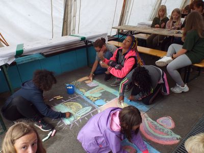 Am Vormittag war im Ani-Zelt ein Kreide-Mal-Wettbewerb. es sind viele tolle Bilder auf den Fußwegplatten entstanden.